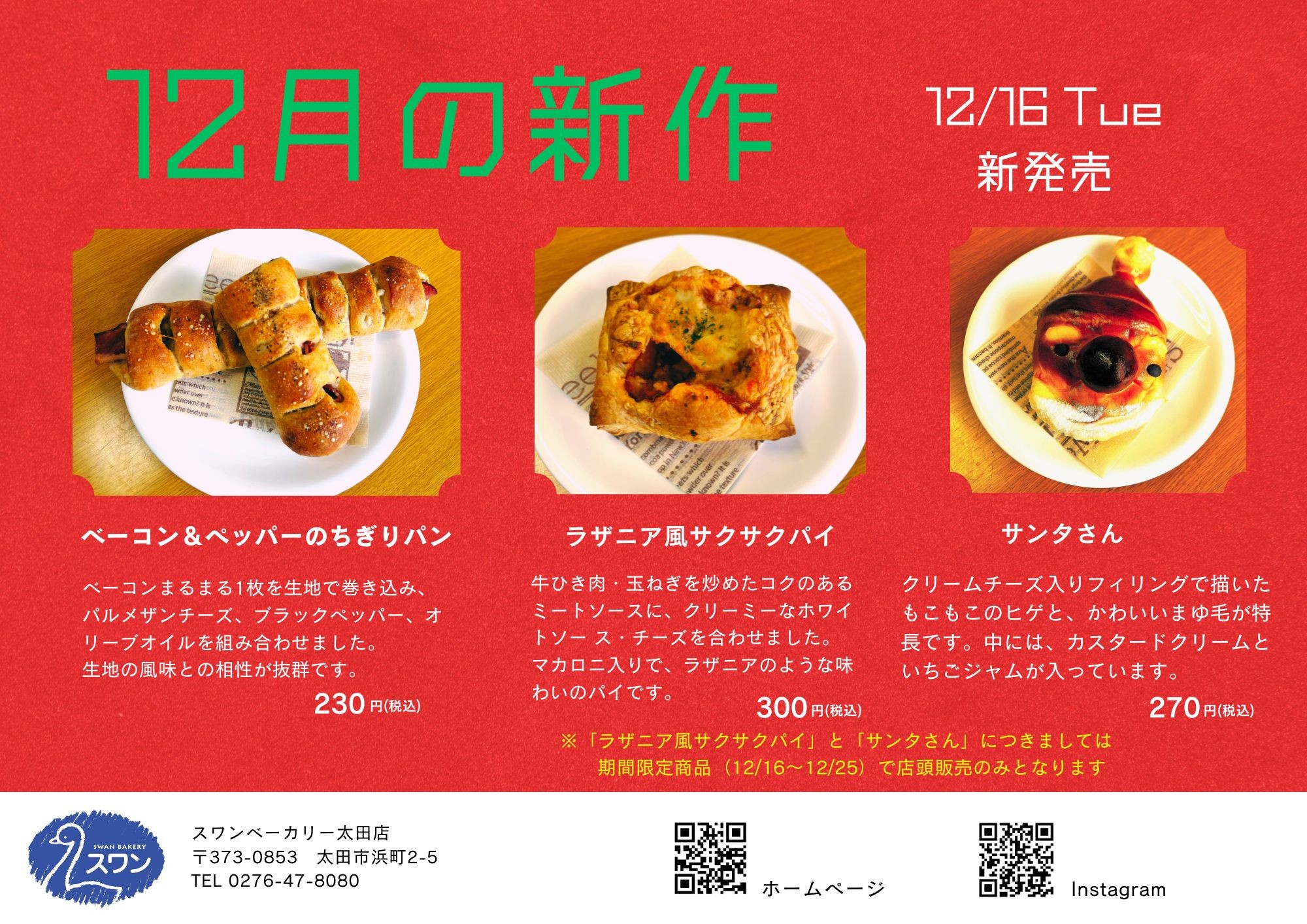 ※「ラザニア風サクサクパイ」と「サンタさん」は12/25までの期間限定商品で、店頭のみでの販売となります