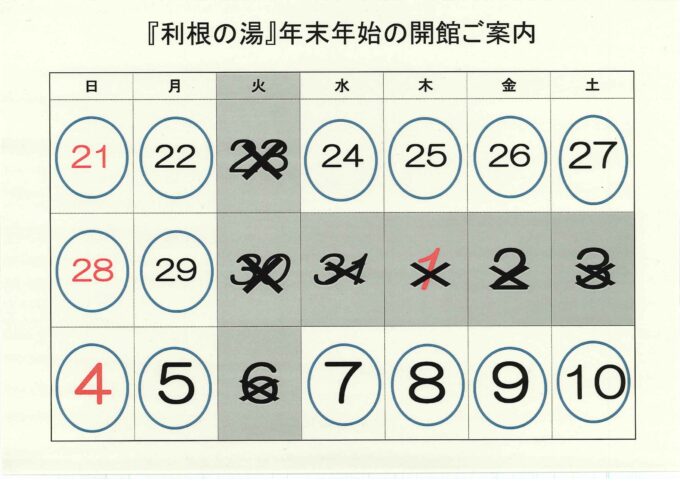 > 尾島温泉 利根の湯 年末年始休館日のお知らせ(12月15日)